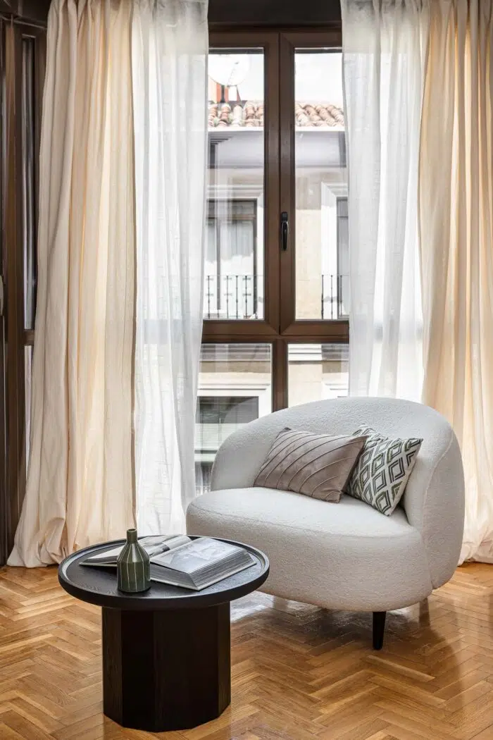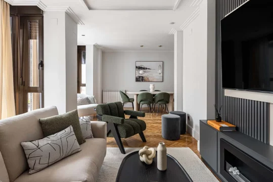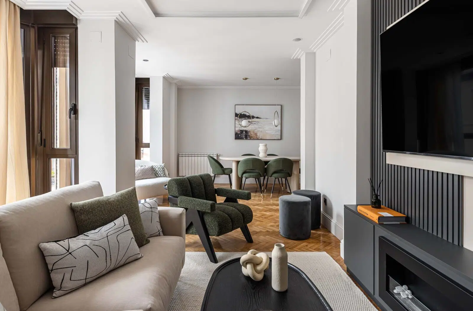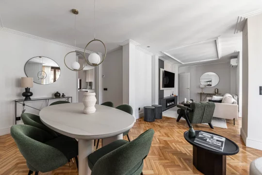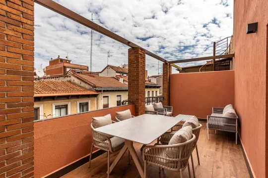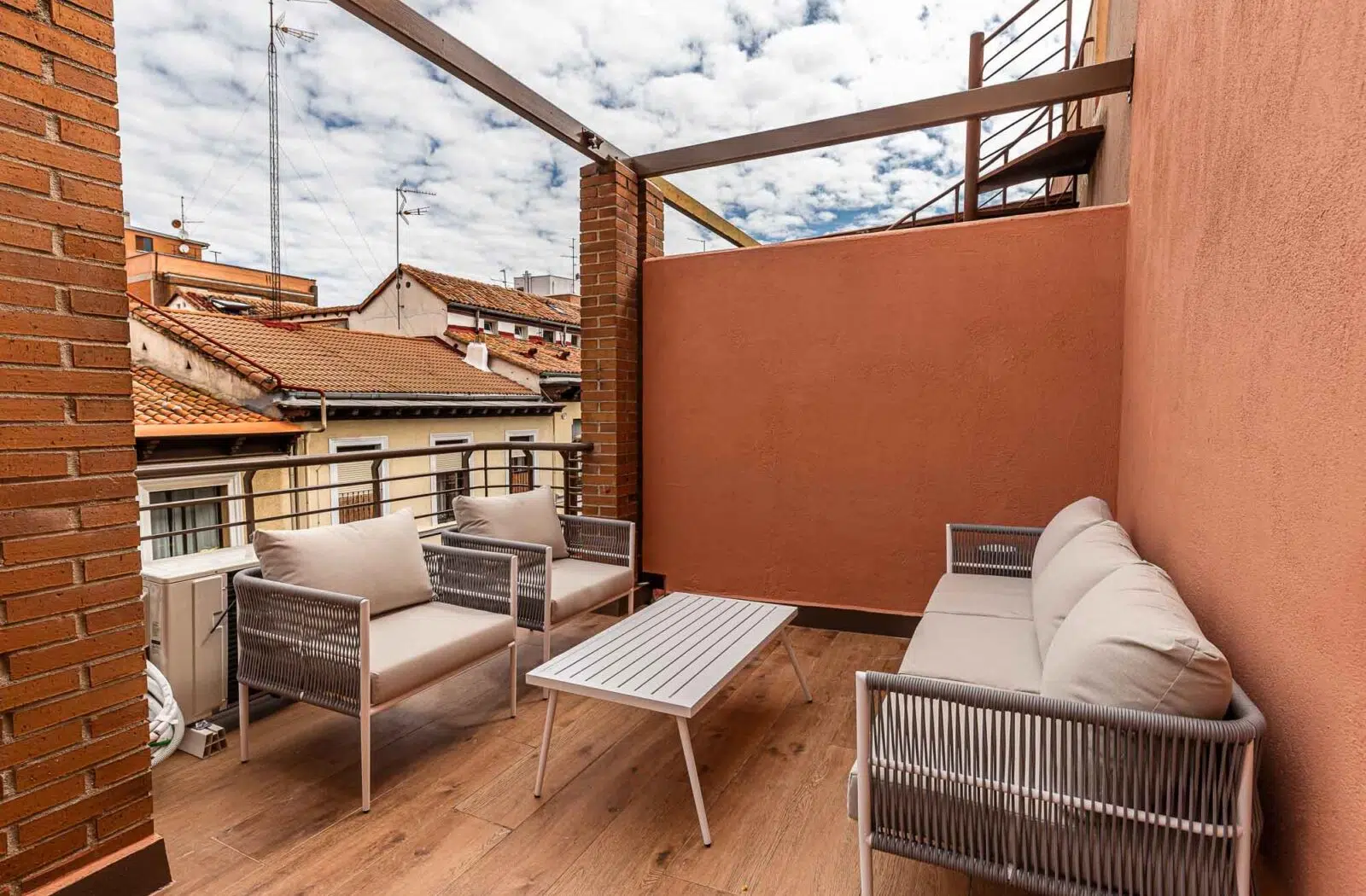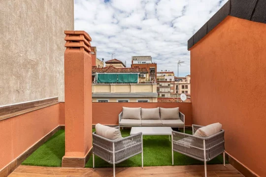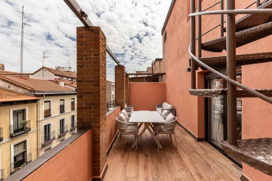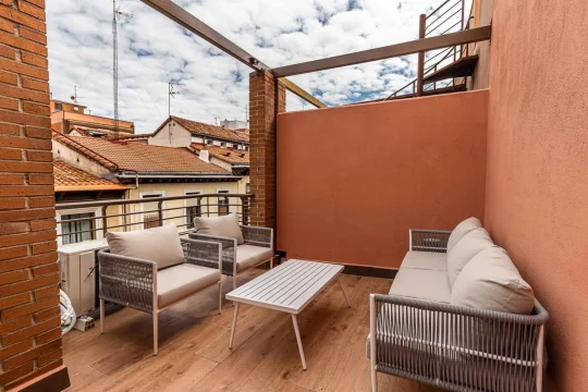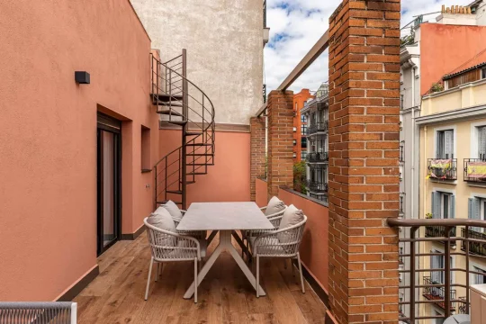 Ático reformado y amueblado de 141 m² en el barrio de Chamberí. Este impresionante dúplex en la tercera planta de la calle Ponce de León cuenta con 2 terrazas, 3 dormitorios, 2 baños y un luminoso salón-comedor con cocina equipada.