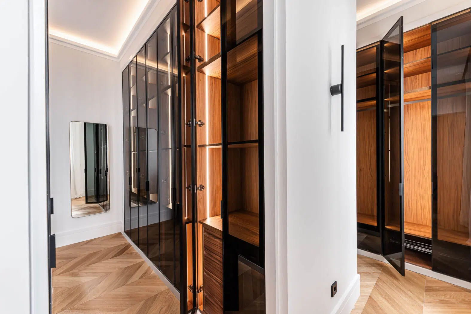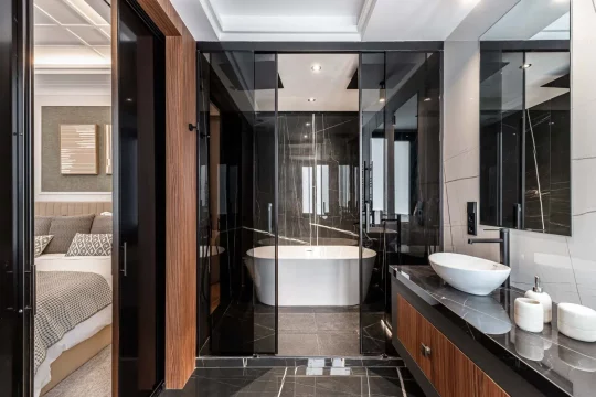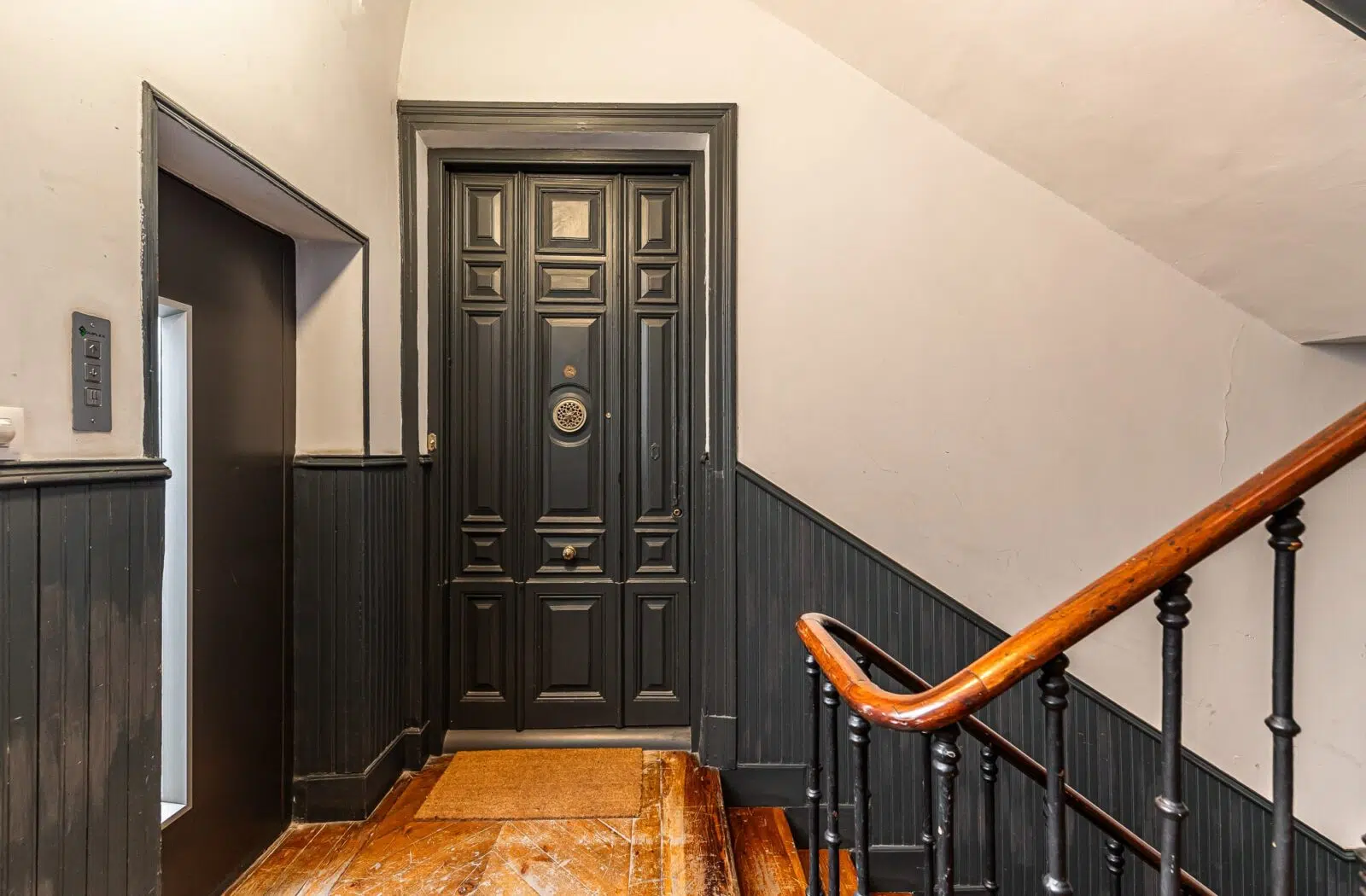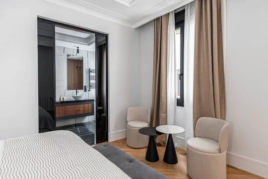 Se distribuye en 3 amplias habitaciones, todas con vestidor y baño en suite, además de un aseo de cortesía. La finca dispone de ascensor y un portal restaurado, conservando el carácter del edificio.